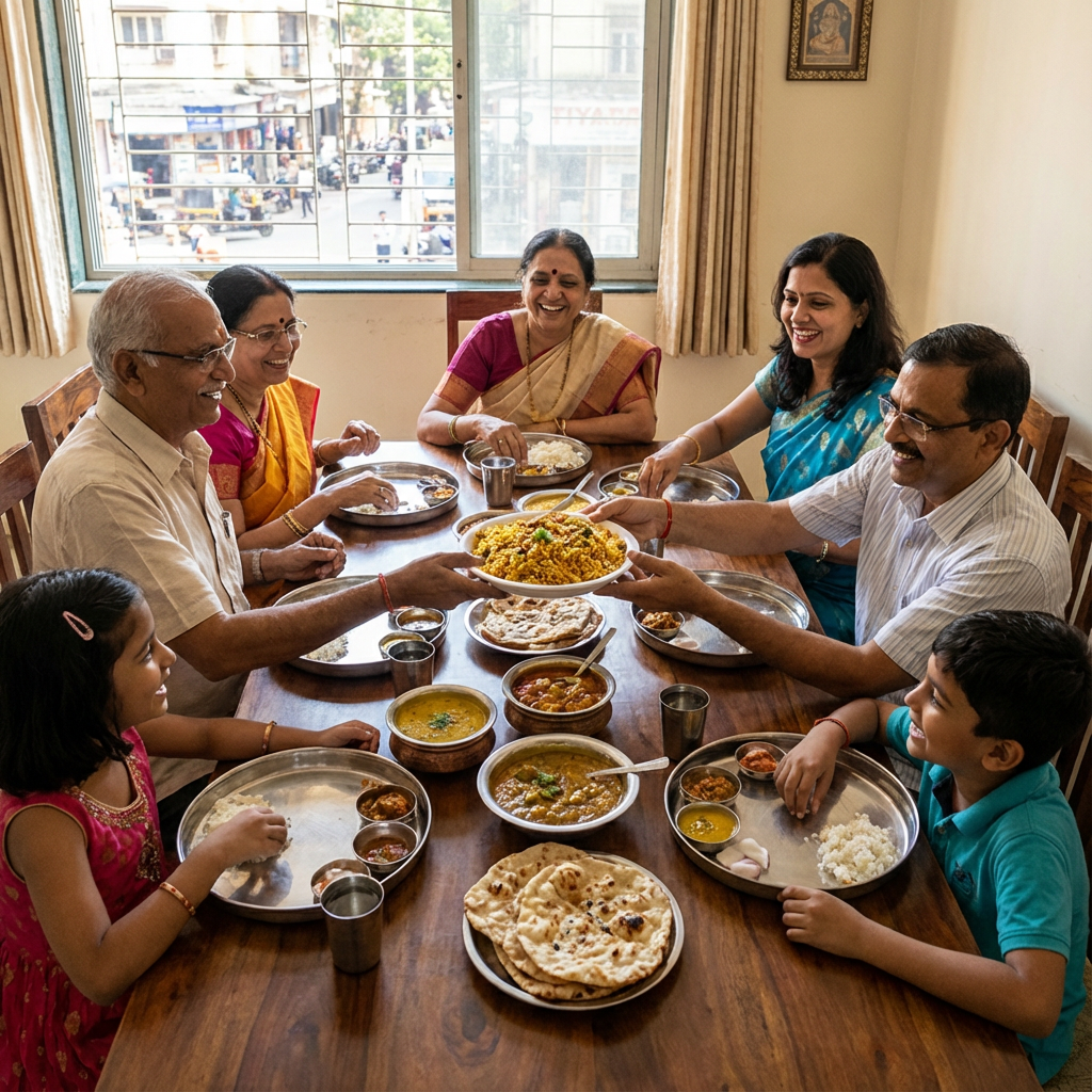 Eat early (helps digestion), then relax with family, watch TV, or share stories.